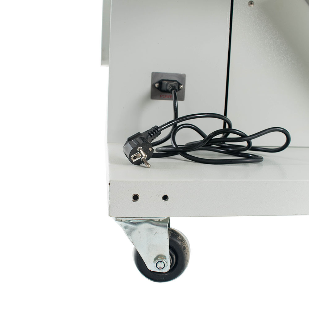 Благодаря четырем колесам, устройство можно передвигать по производственному цеху при необходимости. Есть система тормозов. Управление устройством происходит с помощью тач-скрина, где регулируется скорость и объем, выбирается режим работы. Оборудование не привязано к определенной толщине материала упаковки, можно использовать любую пленку.