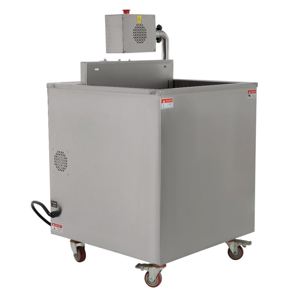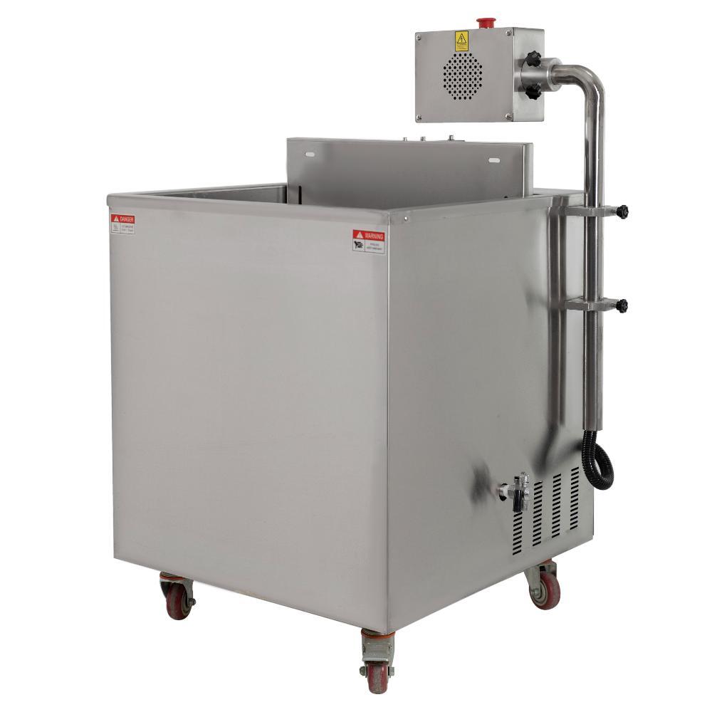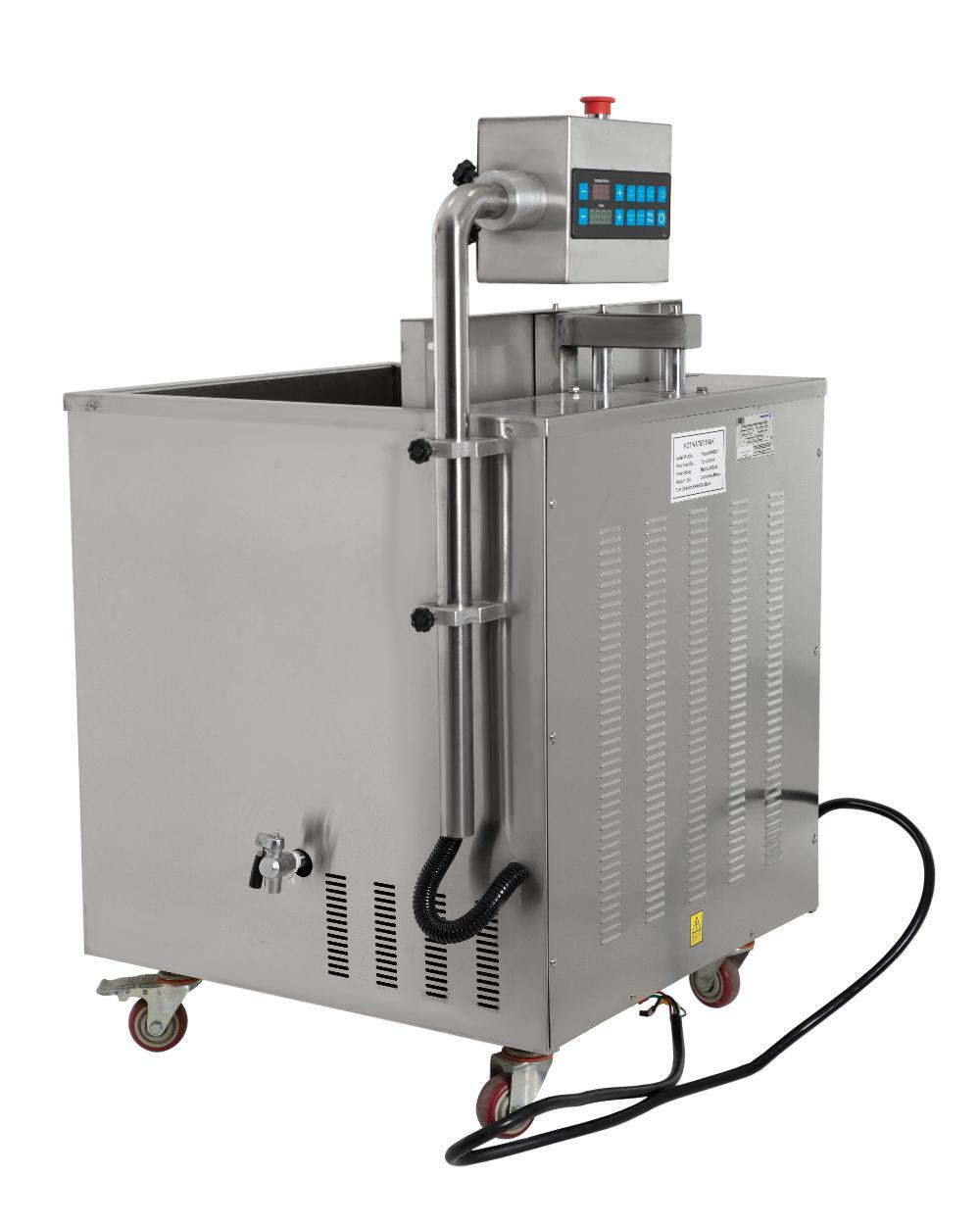 - Затем упаковка с продуктом помещается на платформу термотанка и опускается в ёмкость с горячей водой на 2–3 секунды. Этого времени достаточно для усаживания пакета.