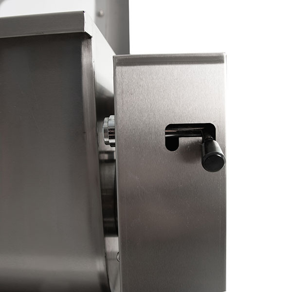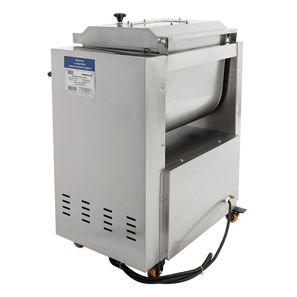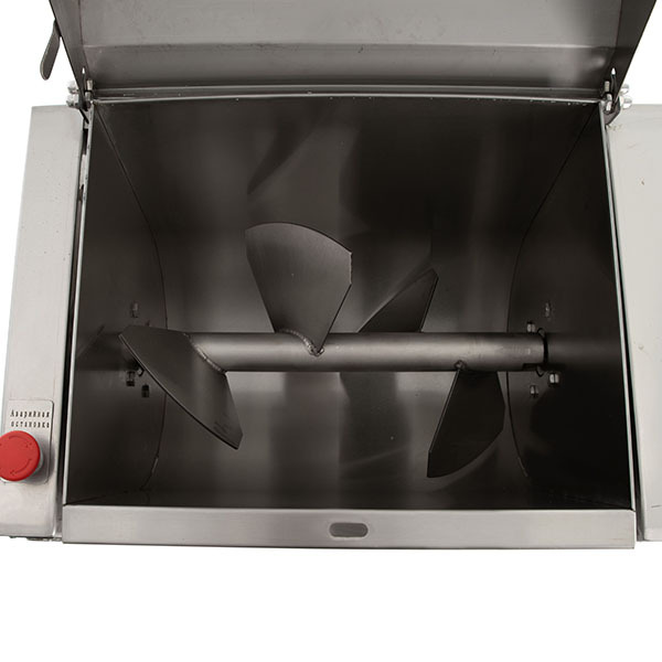 Фаршемешалка имеет удобную конструкцию: при опрокидывании месильной емкости (дежи) оператор повторно включает вращение рабочего органа, и выгрузка готового фарша происходит автоматически. Также изделие имеет быстросъемный рабочий орган, что позволяет использовать различные по форме и назначению месильные лопасти для разных продуктов, а также удобно производить санитарную обработку по окончании работы.