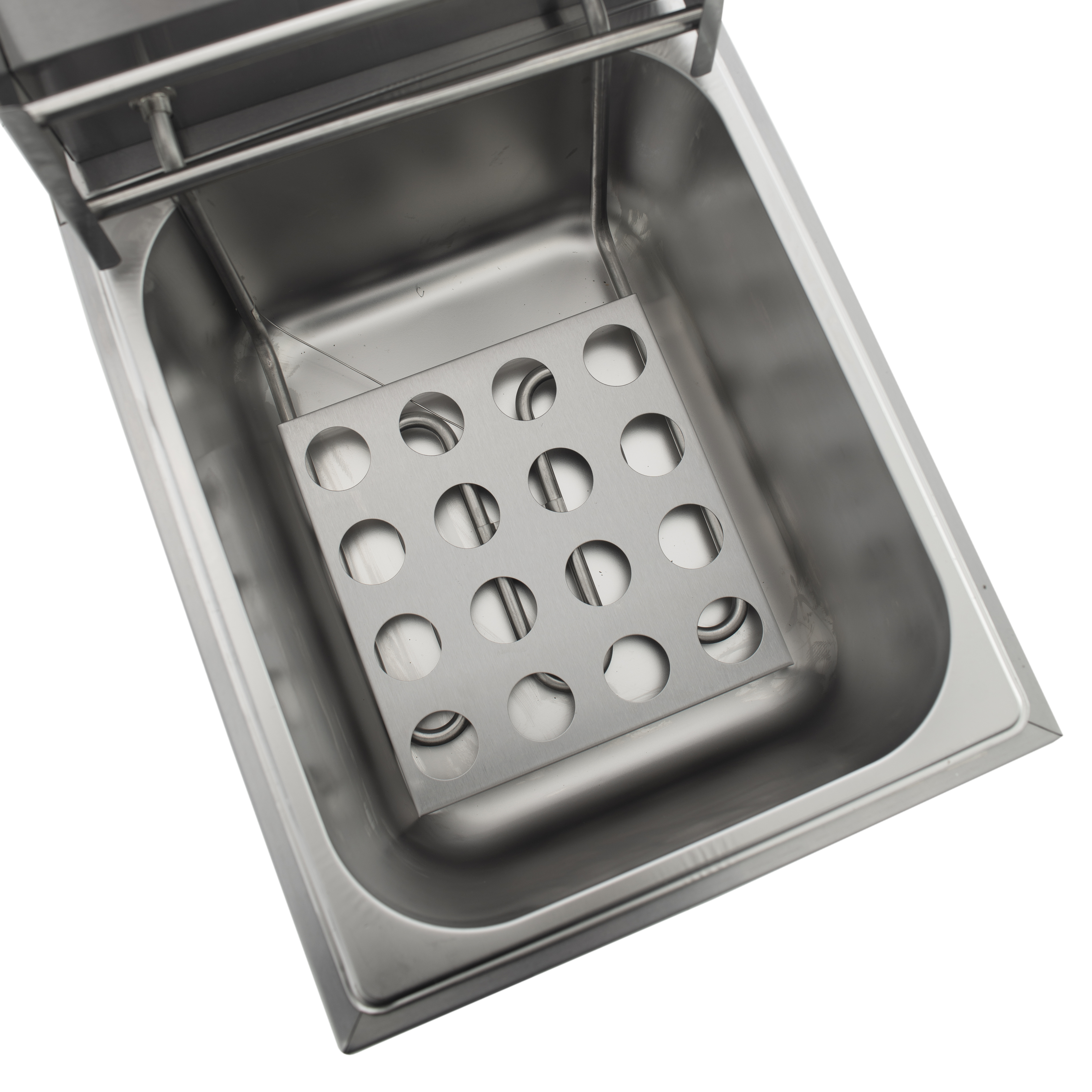 Фритюрница профессиональная DF-81 изготовлена из пищевой стали марки SUS 304 с применением технологий хромирования и окрашивания. Это делает оборудование высокопрочным, нетоксичным, устойчивым к ржавлению и окислению.