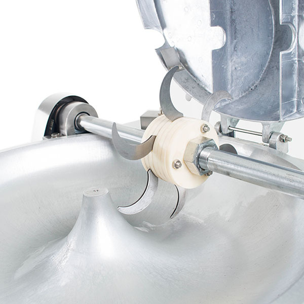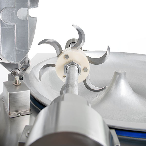 Для измельчения сырья, его кладут в специальную вращающуюся чашу. В процессе работы продукт попадает под вращающийся в обратную сторону нож. Скорость вращения ножа составляет 1350 оборотов в минуту. При этом чаша вращается со скоростью 30 об/мин. Такая разница вращений обеспечивает высокую производительность, которая достигает 150 кг/ч. Принцип работы устройства позволяет измельчать сырье до мелкой консистенции.