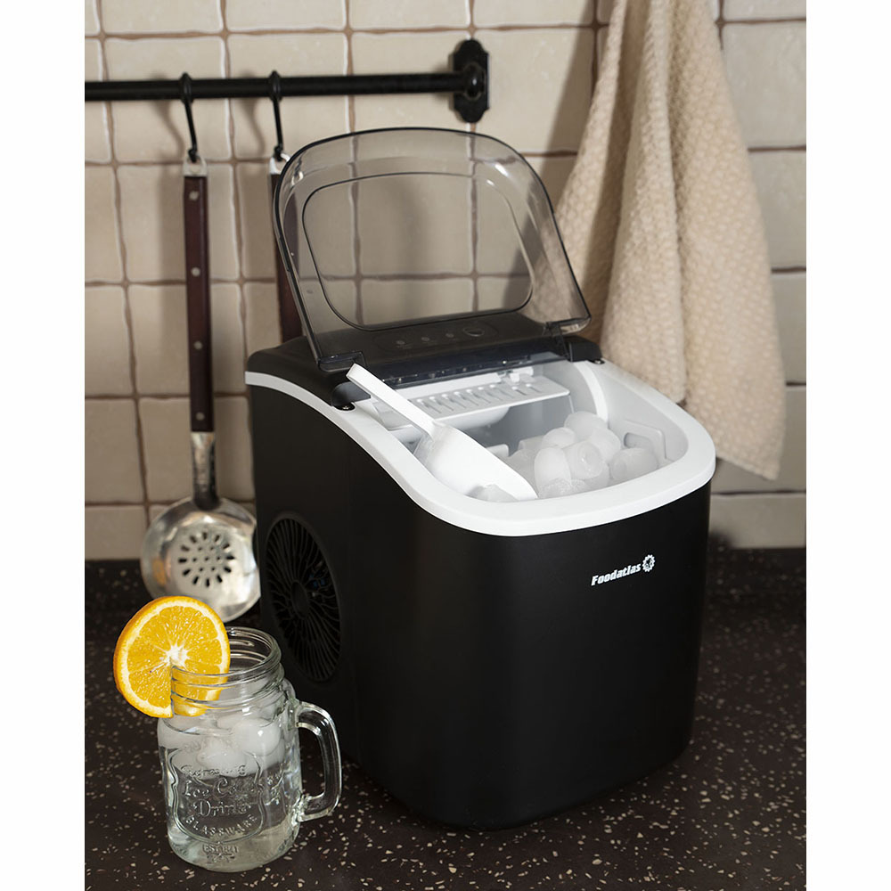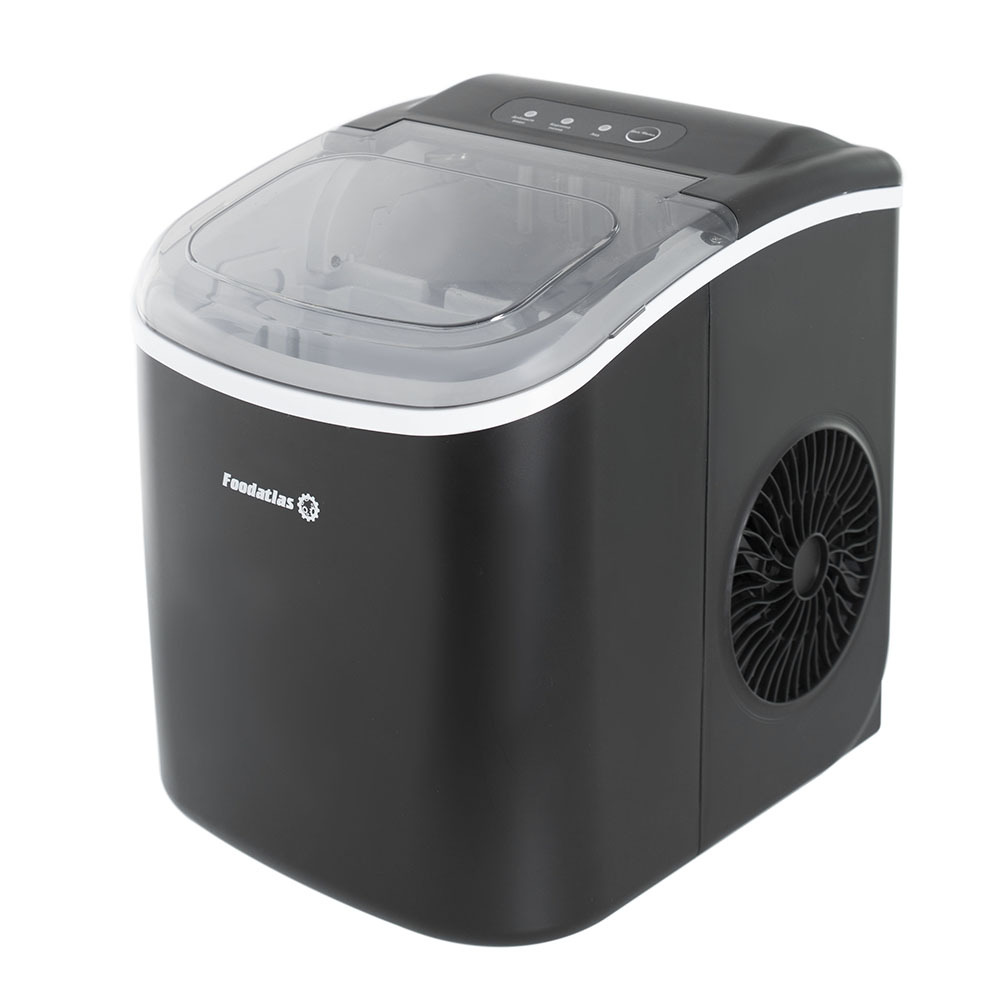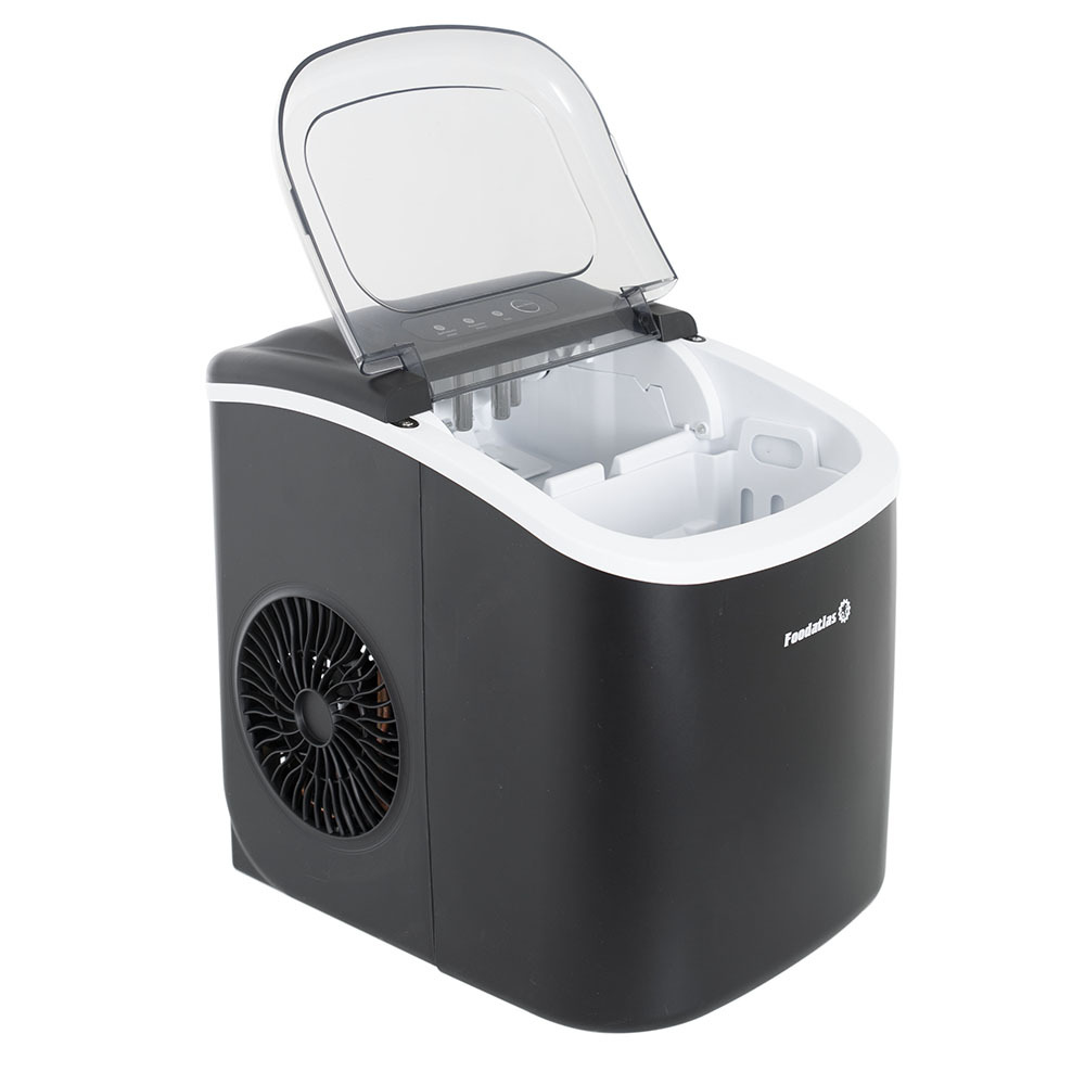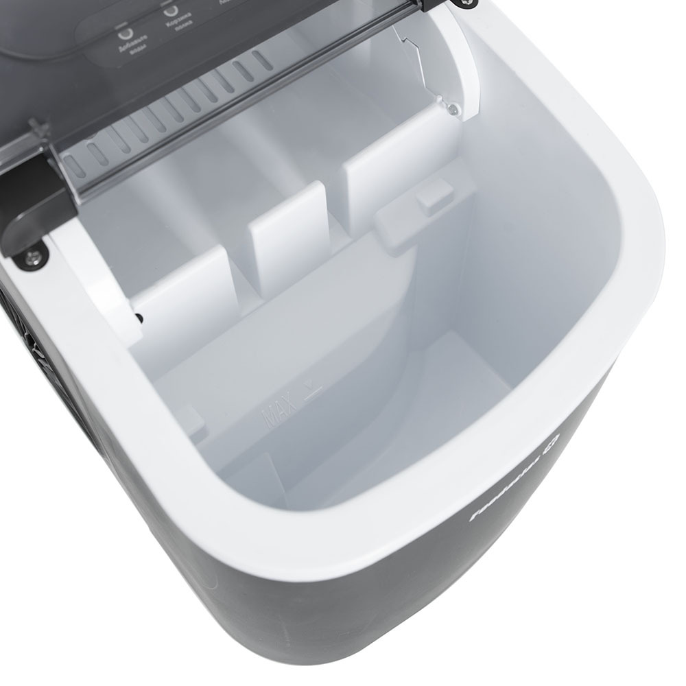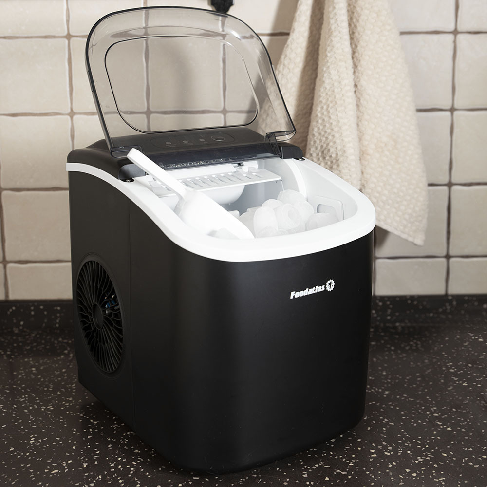 Настольный льдогенератор дает возможность вырабатывать до 12 кг льда в сутки. Компактная установка с габаритами 222*294*290 мм имеет вес всего 6,2 кг. Устройство легко транспортировать на выездные мероприятия. Пластиковый корпус не нуждается в особом уходе. Поверхность можно протирать салфеткой для поддержания опрятного вида.
