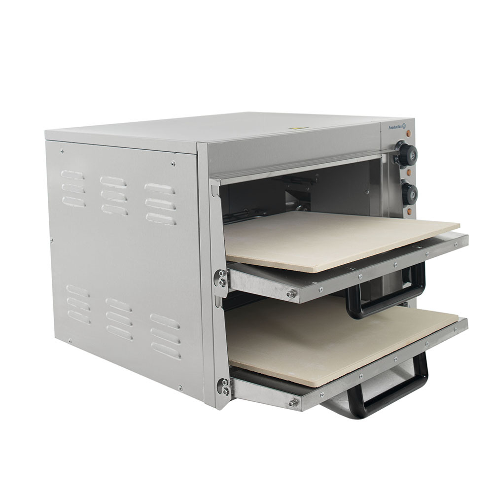 Оборудование имеет интуитивно понятную механическую панель, таймер и индикаторы нагрева. Заданная термостатами температура автоматически поддерживается в течение всего процесса работы. Купите печь для пиццы Foodatlas HEP-2ST и наслаждайтесь ее простым и удобным управлением.