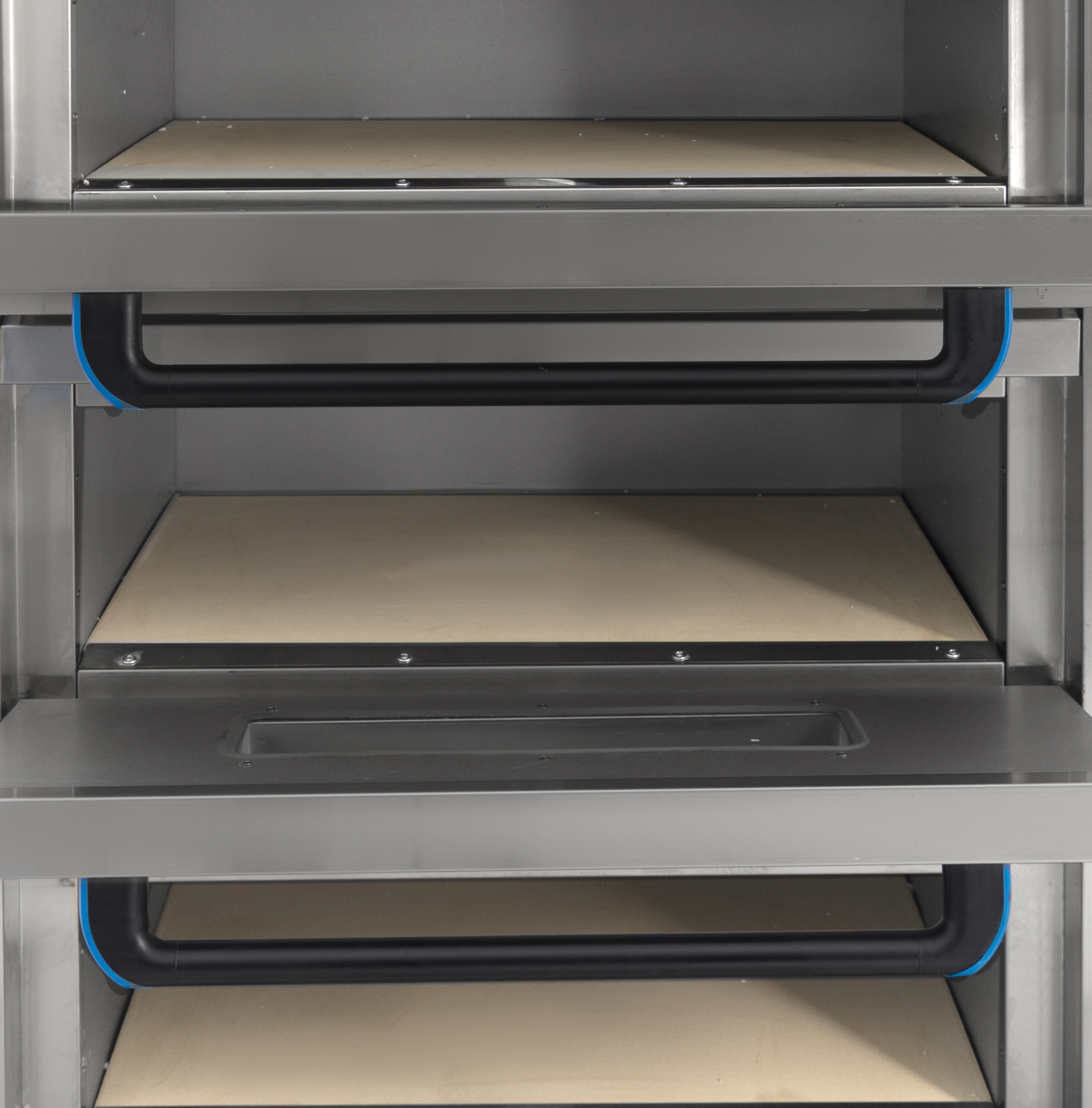 - высокие (180мм) пекарные камеры, позволяющие выпекать формовой хлеб, исключая подгорание верхней корки от контакта с верхней частью камеры (в отличии от пекарских шкафов)