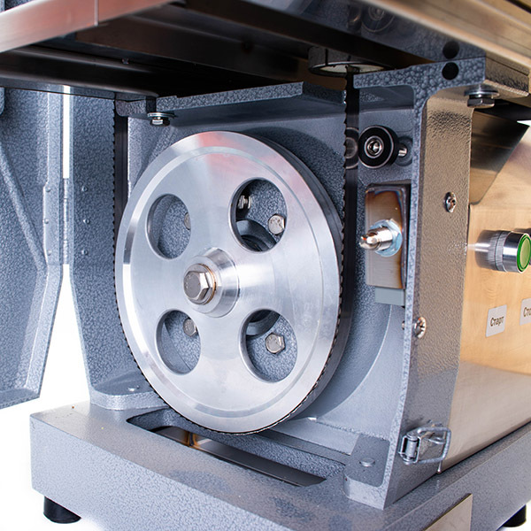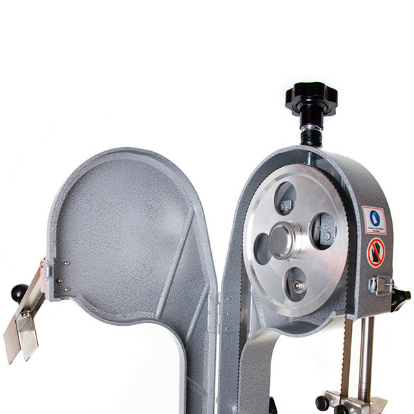 Внешняя закрывающая панель пильного полотна выполнена в единой конструкции для удобства снятия/установки полотна и обслуживания/очистки шкивов. Ведомое колесо (шкив) имеет регулировки по натяжке и наклону полотна – для более расширенного использования разнообразных полотен. Регулировка полотна (натяжение) выполнена в виде рукоятки под пружинным механизмом.