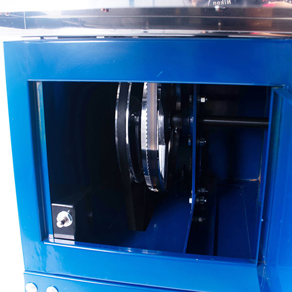 Внешняя закрывающая панель пильного полотна выполнена в единой конструкции для удобства снятия/установки полотна и обслуживания/очистки шкивов. Ведомое колесо (шкив) имеет регулировки по натяжке и наклону полотна – для более расширенного использования разнообразных полотен. Регулировка полотна (натяжение) выполнена в виде рукоятки под пружинным механизмом.