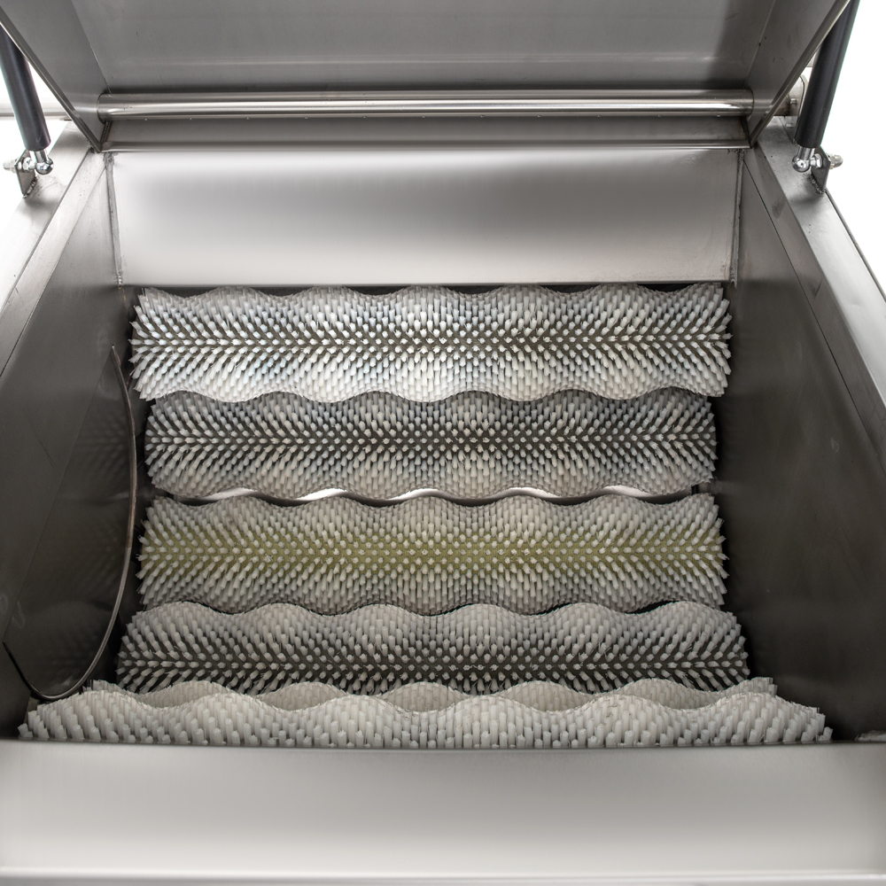 Устройство позволяет переработать до 400 кг сырья в час. В систему загружаются овощи и фрукты, на которые из верхнего коллектора с форсунками подается вода. Овощи постоянно соприкасаются с щетками и между собой, что обеспечивает тщательное удаление загрязнений. Для большей загрузки в системе предусмотрено 6 роликов.