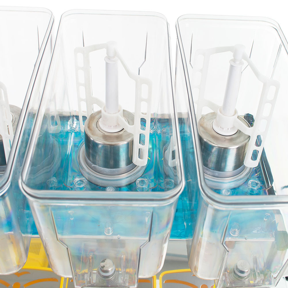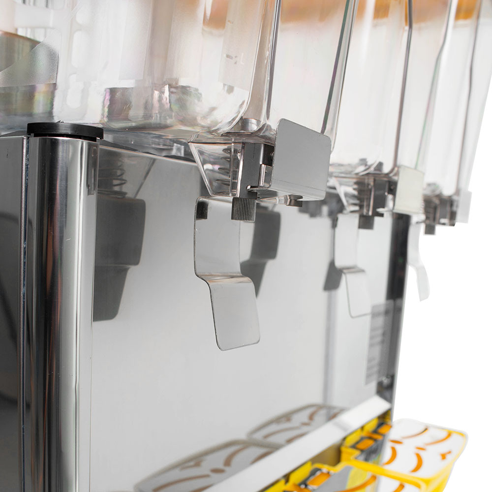 Предназначенные для напитков стеклянные ёмкости закрываются пластмассовыми крышками. Они, как и фигурные краники, привлекают дополнительное внимание к сокоохладителю.