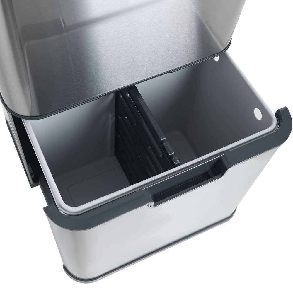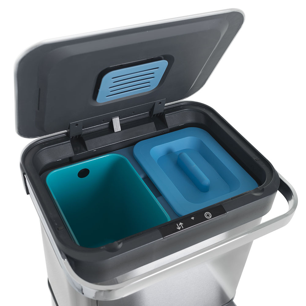 Стальной корпус сочетает в себе долговечность и современный стиль. Благодаря разнообразию объёмов сенсорные вёдра используют не только дома: на кухне, в санузле, в детской комнате; но и в офисах или обеденных зонах компаний, а также в загородных домах и коттеджах. Надежное ведро-вставка и фиксатор мешка делает использование мусорного ведра удобным на протяжении всего срока эксплуатации. Особенностью данной модели является разнообразие в открытие верхней крышки, которыми возможно воспользоваться в зависимости от ситуации.