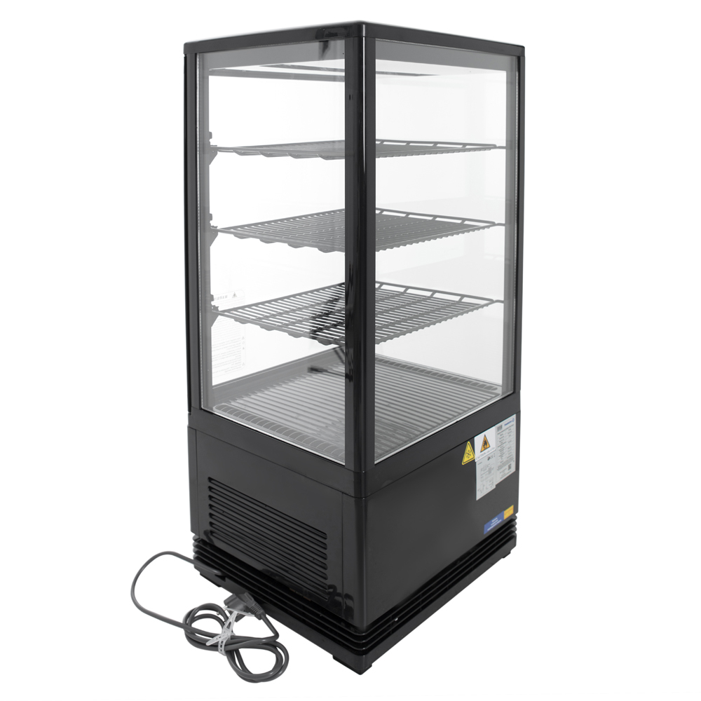 Компактная витрина устанавливается на столе или другой ровной поверхности. Габариты витрины составляют 428*386*885 мм, а объем камеры – до 68 литров. Конструкция подразумевает установку дополнительных полок или противней, чтобы увеличить полезное пространство. Металлический корпус не требует особого ухода. С поверхности легко удаляются загрязнения влажной салфеткой.